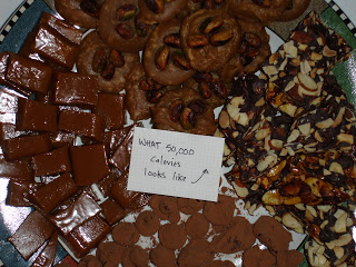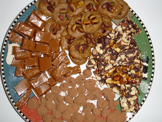 Rum caramels, Pistachio pralines, Almond bark, Chocolate kisses