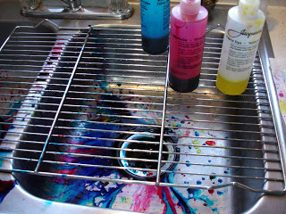 On Sunday afternoon we popped the included DVD into the TV and watched a nice long-haired lady with little round glasses and a certain “life is cool” aura demonstrate how to make the different patterns: random, bull’s eye, stripes, mirror image, spiral. We donned our latex gloves and got going.