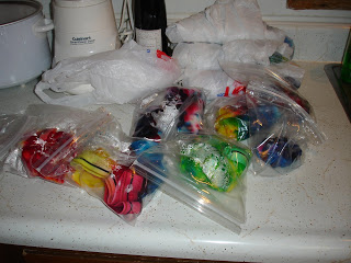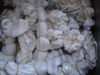 Last night we finished up the second project of the weekend: tie-dying underwear. You may think this is odd. And, yes, it probably is. For a white elephant gift last last Christmas, Bill got a tie-dying kit and it’s been sitting in the closet for a year. Because, really, once you hit a certain age and/or professional status, it just really isn’t cool to wear tie-dyed t-shirts everyday. Maybe one for mowing the lawn or as pajamas, but you can’t wear it to work or school. So, what to do? Underwear just seems to follow logically.