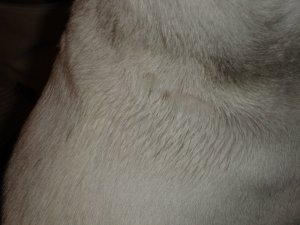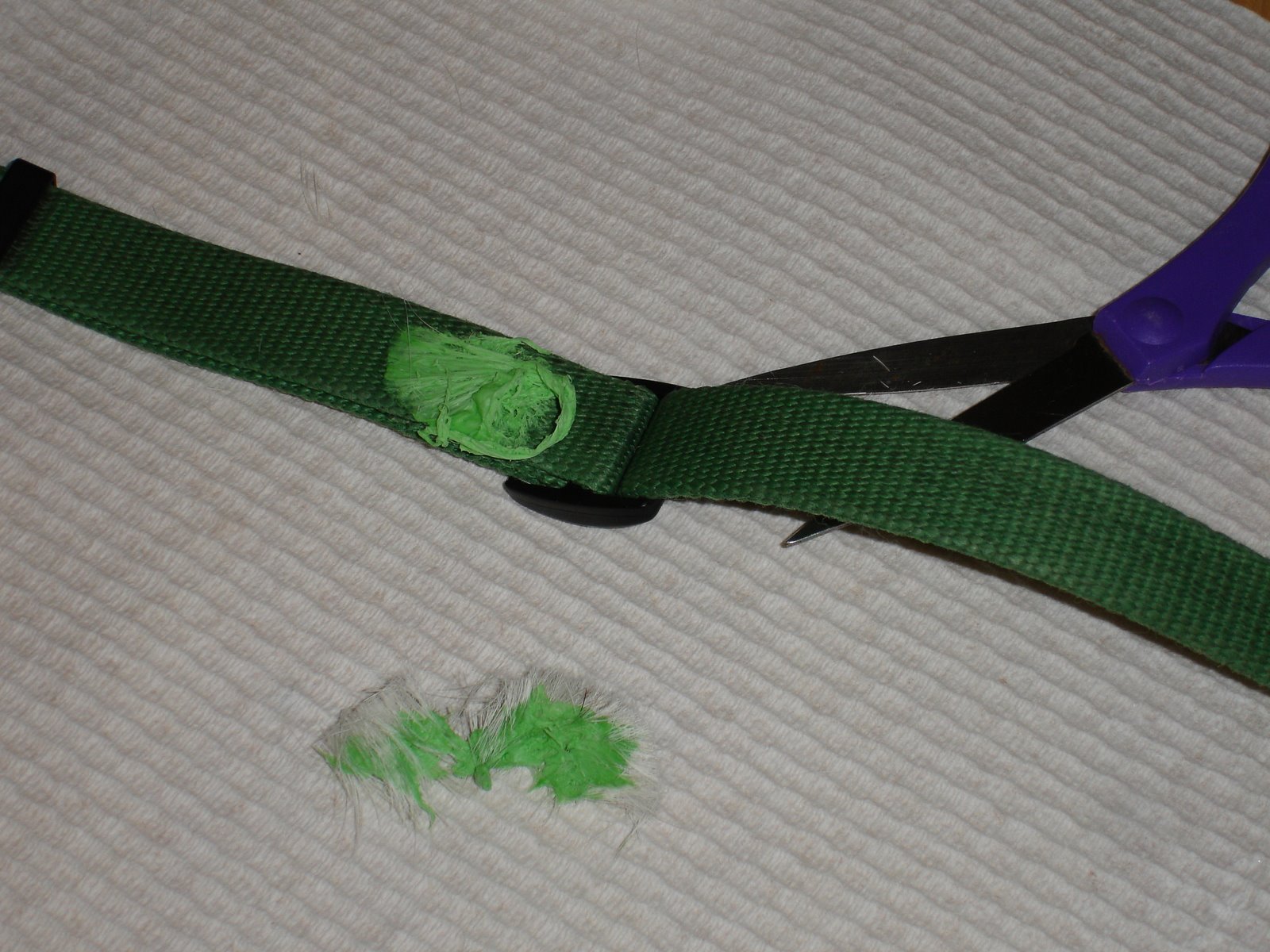 Just in case you’re curious, it’s the dog’s collar that needs fixing. Apparently on our walk through the park yesterday while rolling around, some gum worked its way to the inside of her collar. Between fur and collar, that is. And it wasn’t until around 9 PM that we noticed it. Lots of time for it to make itself comfortable against a warm puppy body. I cut the offending part out of her fur. The pathetic dog has kind of a bald spot on her neck now; I was more concerned with getting it all than blending the trim with the surrounding fur. The collar is proving stubborn, however.