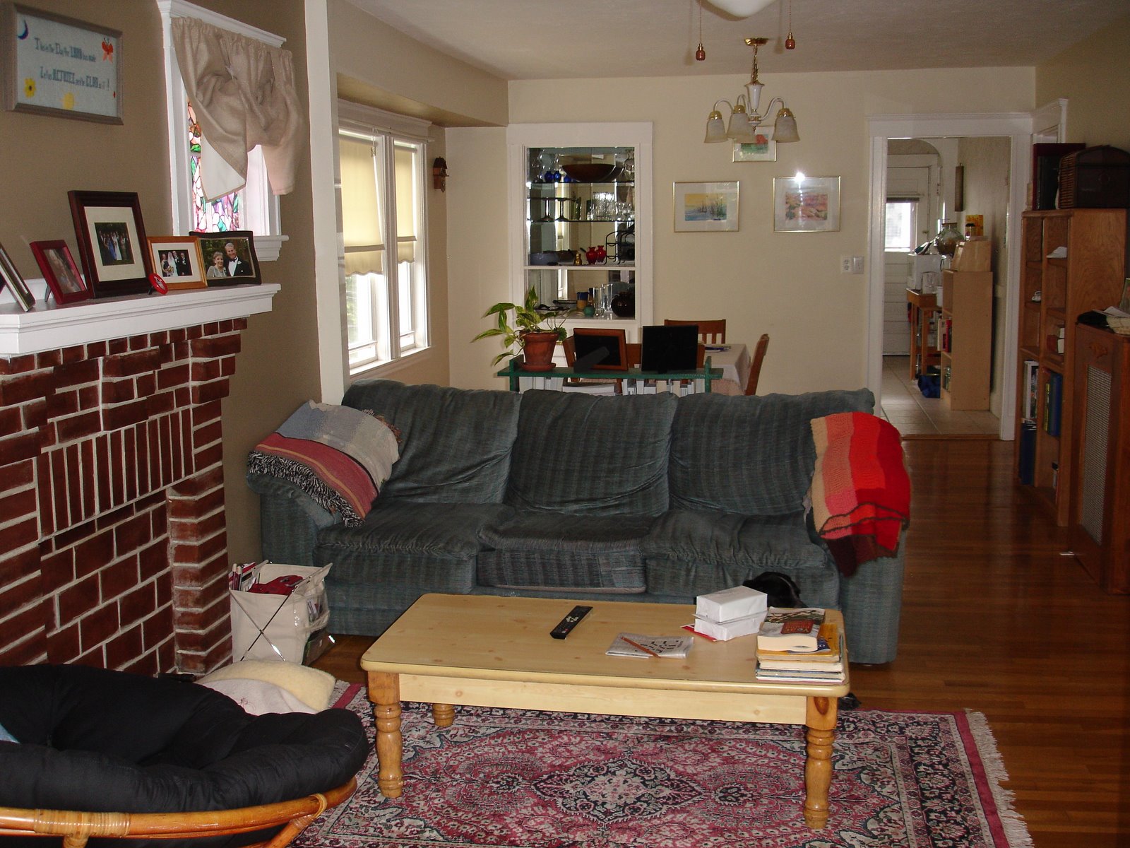 You enter the living room looking the faux fireplace head-on. Here’s a long view from the living room back to the dining room (with a built-in hutch in the left hand corner and the door to the kitchen in the right-hand corner):