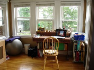 Since the stove and refrigerator are on the other side of the room than the counters and cupboards (see one of our gas burners at the very bottom left-hand corner?), we have a little island on wheels that we can take from one side to the other.