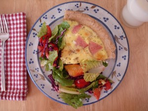 Today we were inspired by the movie Waitress to make a Good Baby Pie (in the movie it’s not “Good,” it’s “Bad,” but we didn’t want to deal with any copyright issues, plus we knew it would be so tasty we’d have a hard time calling it Bad Baby Pie). It’s a quiche with slices of brie and pieces of ham as the filling. Sounds good, huh? It was the first quiche any of us had made, so we didn’t know exactly what to expect. We averaged together the recipes we found in various cookbooks, and what we ended up with was this: