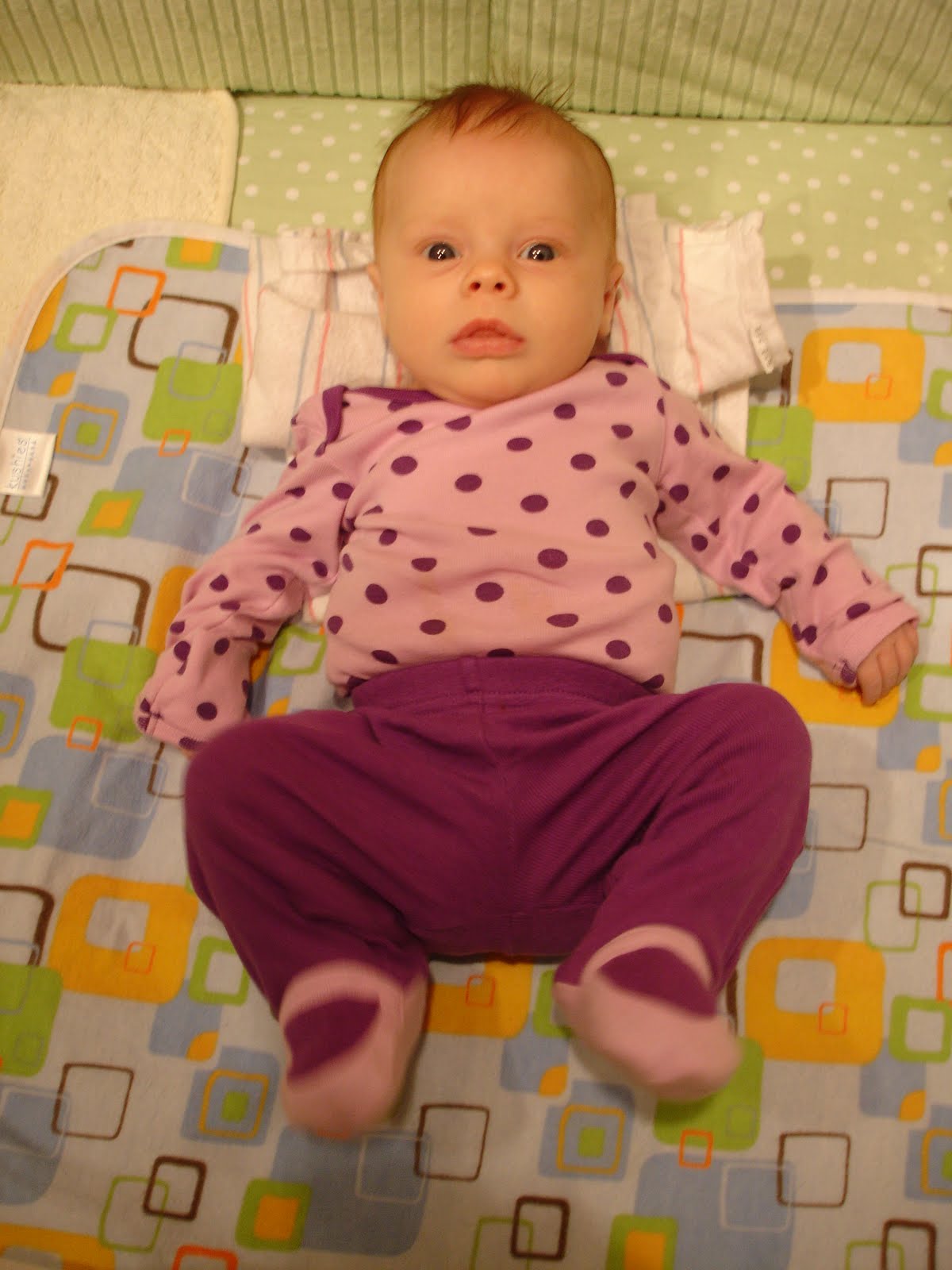 Favorite mid-night escapade: After Maggie ate, sometime around 1:30, she and I got up to change her diaper and have a little kicking around time. I turned my back to throw away her wet diaper and when I turned back, she’d spit up a little bit. It had run down her cheek onto the shoulder of her pajamas, so I decided we should have new warm pjs. Nothing else to do, right? So I picked out a matching item and was taking off her top layer. When I went to bring it down from her head, I noticed that her under layer was wet — apparently she peed all over herself while I was going through her drawers. Okay, no problem. We have fresh clothes right here. All we have to do is take off the new top layer and the old under layer and relayer with a new under and the new upper. Ta da. Alright. Time to burp after eating. Up we go and pat pat pat. “Achoo!” Bless you, Maggie. And then another sneeze and a burp at the same time. Oops! Too much going on at once! The combination of sneezing and burping made her gag which resulted in a bit of a vomit episode, all over my top layer and under layer, and her top layer and under layer. She’s happy as a clam, by the way. No longer up to the top full, no air bubbles in the tummy, and more time turning around and sitting up and stretching arms and legs while we put on a new new under and upper layer. And eventually we went back to sleep, both of us in nice new pajamas.