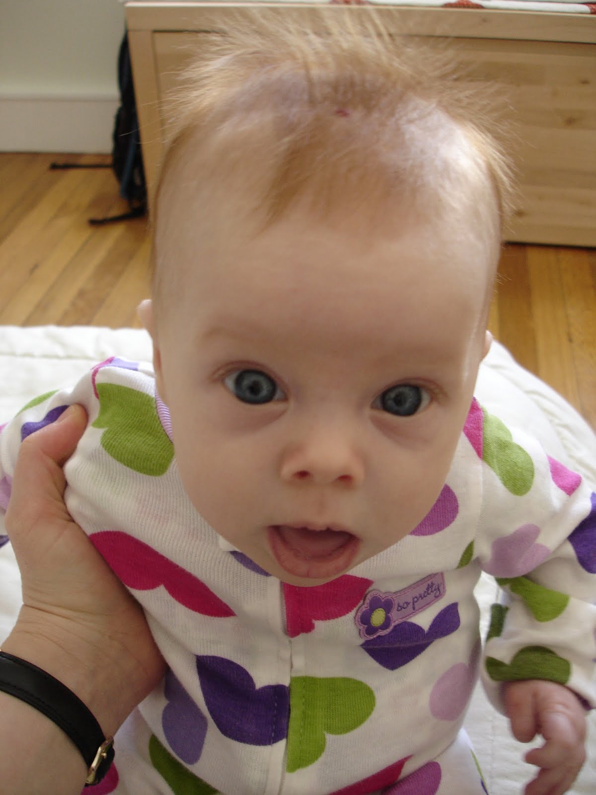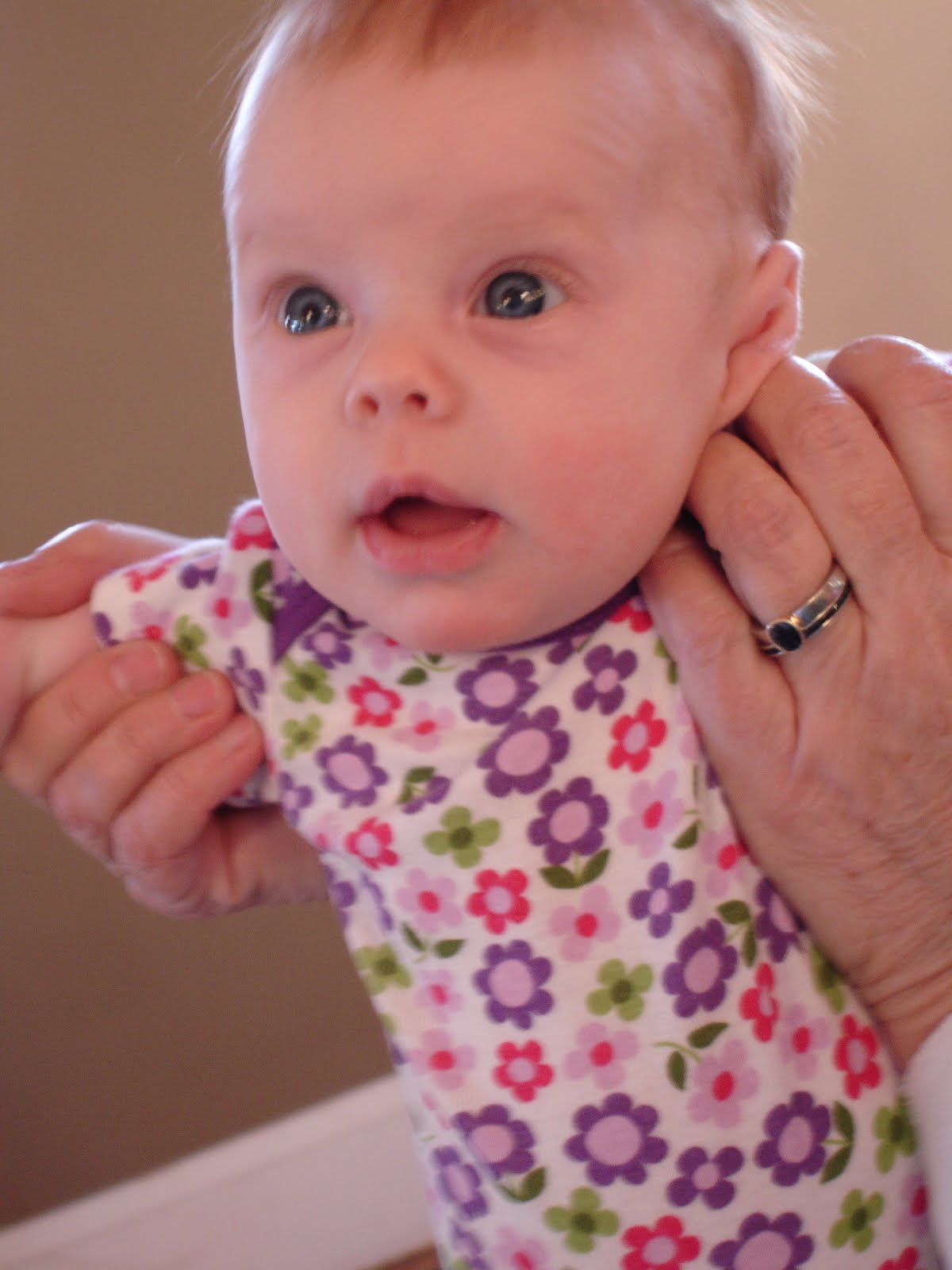 Favorite hand — right. She’s beginning to reach out for objects in her line of sight. Looks like she’s gonna be right-handed.
