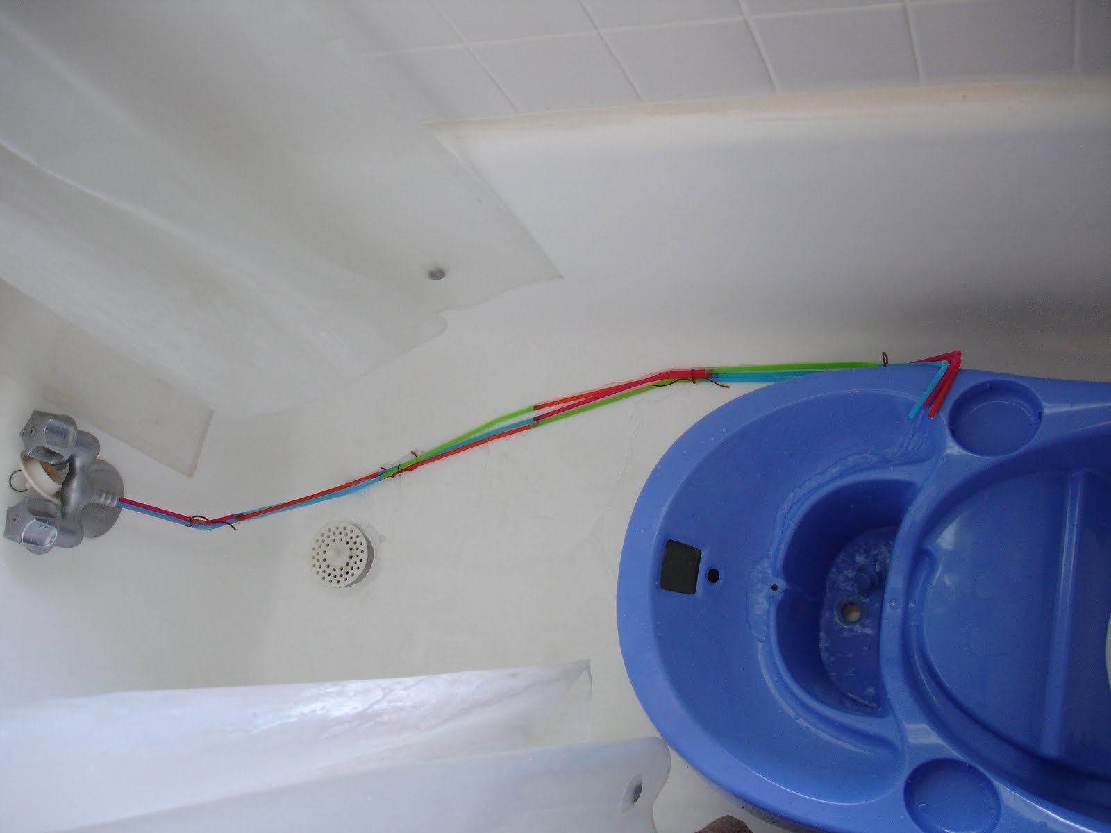Bendy straws, three wide and six long, fit up the faucet and to her little tub where she can lounge and flap around safely while I’m at the right end of the tub showering. We’re facing each other this way too so she can be amazed at Mommy’s hair turning white suddenly and then miraculously back to normal. Wax keeps the joints of the straws sealed and the thermometer keeps the water the correct temperature so the wax doesn’t melt. Not an engineer, indeed!