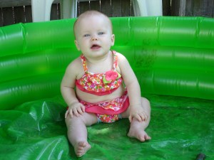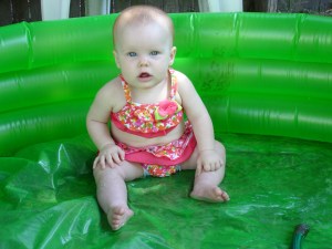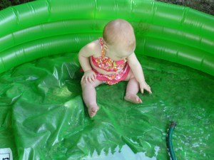 She also went “swimming” for the first time this week. It’s been so hot that walking the dogs is not so nice. So they can be out in the backyard for a little outdoors time and we can be in the pool. You can see the progression of comprehension in these pictures.