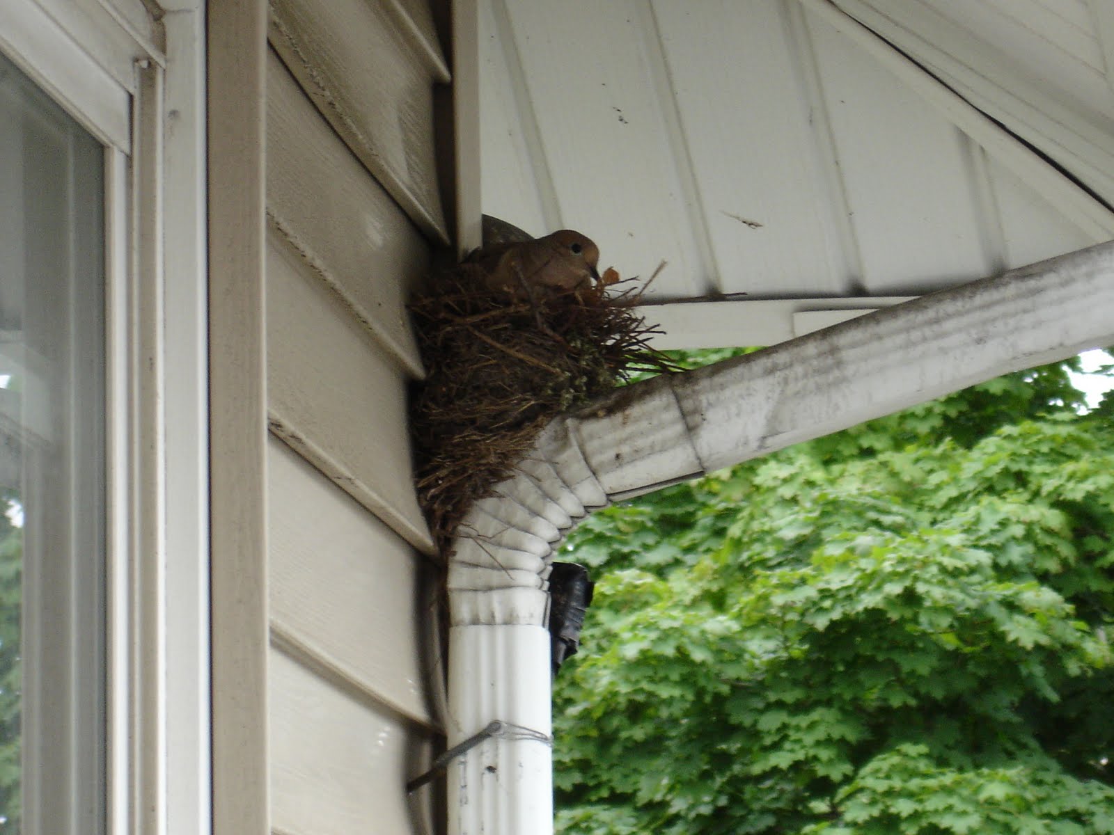 There’s a new resident in our household: The Mother. A dove has inhabited the nest on top of our gutter drainpipe. The nest has been there for years, according to the landlord, but we’ve never seen anyone in it until The Mother came and sat upon it earlier this month. So far she’s just been sitting and biding her time. She doesn’t care when we come out on the balcony to pick basil or ride the stationary bicycle or throw away diapers. She’s set up residence and we are awaiting her bundles of joy. Anyone know how long a bird sits on eggs so we can have the car gassed up and ready for delivery at any time?