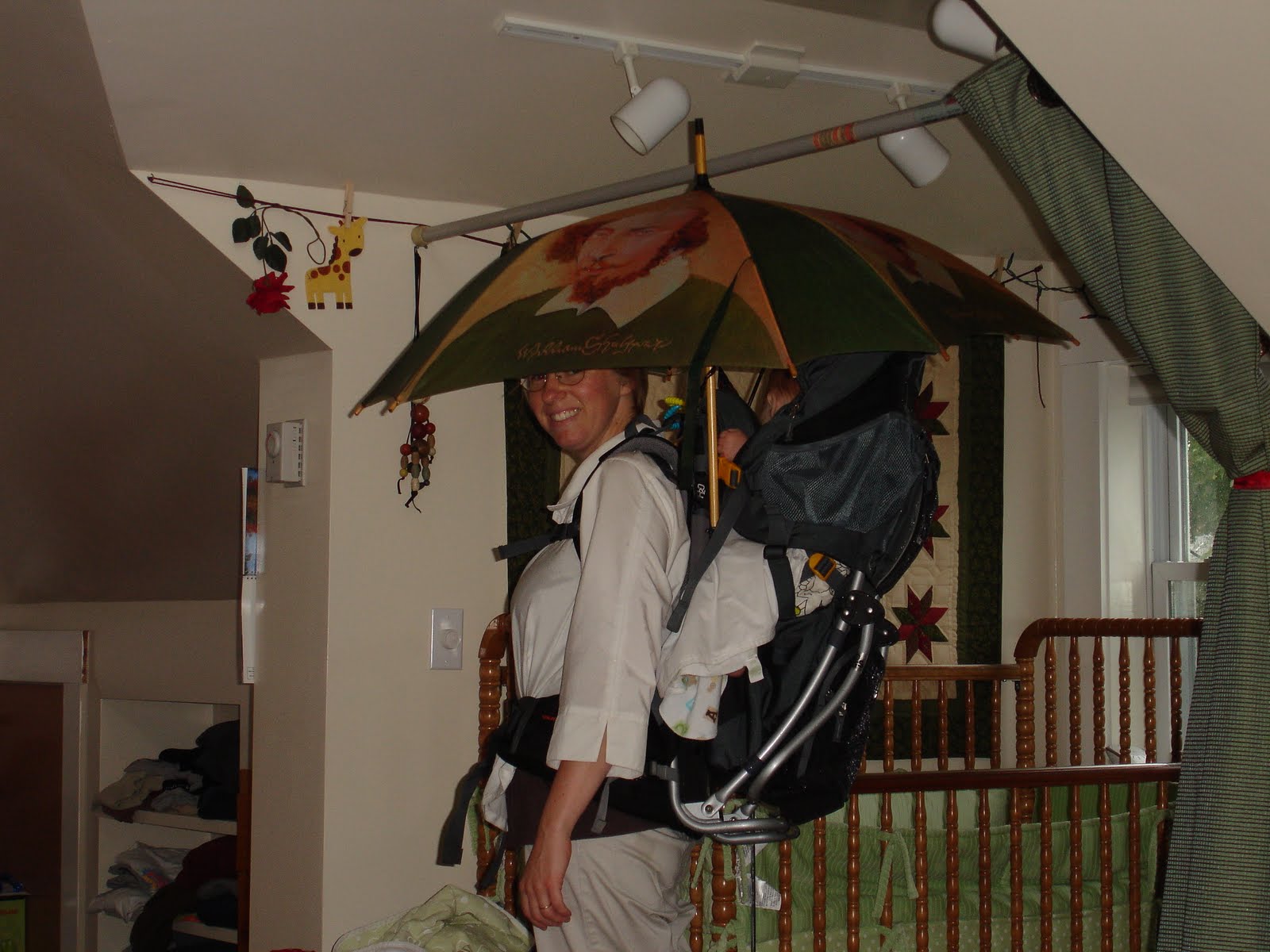 Isn’t there some saying about mothers and inventions and necessity? Well, here you go. And we did just fine this way. Baby stayed dry, mom stayed mostly dry, and each dog had a leash hand. Walk accomplished.