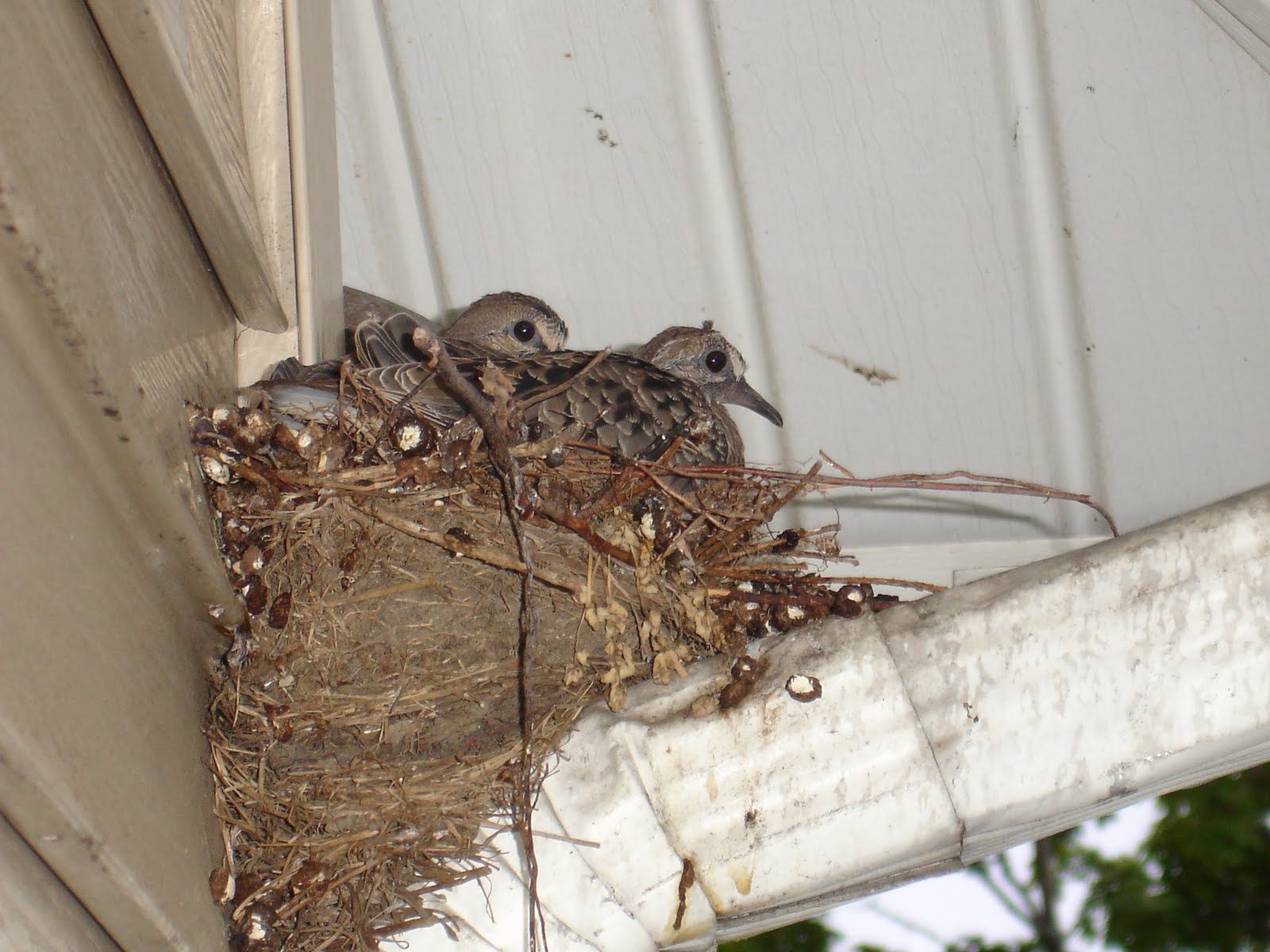 Remember the mother dove on top of our drain pipe? Well, she hatched herself a little birdy, right after I posted the blog entry about her. Then before you can say downy feathers, he grew all up and flew away. I never got a chance to get a good picture of him. So you’ve been in suspense all this time, I know.