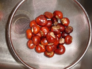 It’s been a couple weeks of this activity, and one or two chestnuts a day makes for quite a haul over a long period of time. One day after a windy night we found 35! Now we can make chestnut turkey soup and chestnut butter and who knows what else.