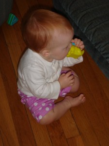 What’s new? We think Maggie is going to be left-handed. She always reaches for the spoon with that hand. If a cheerio gets into the right hand, she transfers it over before putting it in her mouth. She’s still a happy crawler — not too much effort trying to walk — but all of her friends are graduating to the next level at Gymboree. Level 3 means baby dear is more comfortable standing up than being on the floor and is trying to do the walking thing. She’s close, but for now she’ll stay behind. That’s okay; I get three classes for the price of one at level 2. When she graduates it’ll be two classes a week and both charged. Also, she’s pretty solidly down to one nap a day. She would sleep in the morning if I let her, but we’ve found that she doesn’t really sleep at night if she takes two naps. (That is, of course, under normal circumstances. With teeth coming in she doesn’t sleep at night even with just one nap.) It’s a nice sized sleep, though, so I do get to accomplish some things. It’s amazing what you find you can do in just 2 hours. And speaking of which, off I go while the munchkin snoozes. Happy Monday!