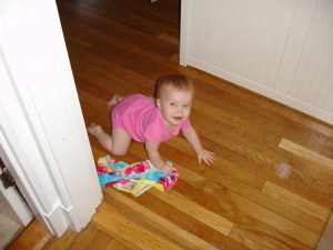One of the funniest things that happened this week involved Maggie finding a new toy to play with. She pretty much has the run of the house now. We close the bathroom door and keep an eye on the kitchen and everything else has been babyproofed for our crawling monster. So she’s playing independently in the second bedroom where there’s a full length mirror. Totally normal; she loves the baby in the mirror. A quick peek to check on her after a while revealed not a conversation with the baby but a game of peek-a-boo. Fun! Except. Remember that weekend where we tie-dyed underwear? Boy, are they colorful items of clothing — really stand out to a little person. Especially when they’re down at her level. In the dirty clothes hamper. After being worn on a nice long bicycle ride. Gross!