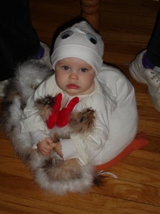 Ah. Being the parent of a one-year-old trick-or-treater is the best. You go to all these people’s houses and they squeal over what an adorable turkey you have, they give you whatever candy you say you like best, and no one even mentions how you’re abusing the system. Maggie did great trick-or-treating. She even waved at a couple closed doors and said “boo” once while walking down a driveway. It was a cool evening, so it was a good thing she had on a couple layers and was stuffed with bunting and then covered in down. By the end of the evening she had less feathers and half her turkey waddle, but it was super fun. She loves going for walks, so this was just another variety of late afternoon stroll for her.