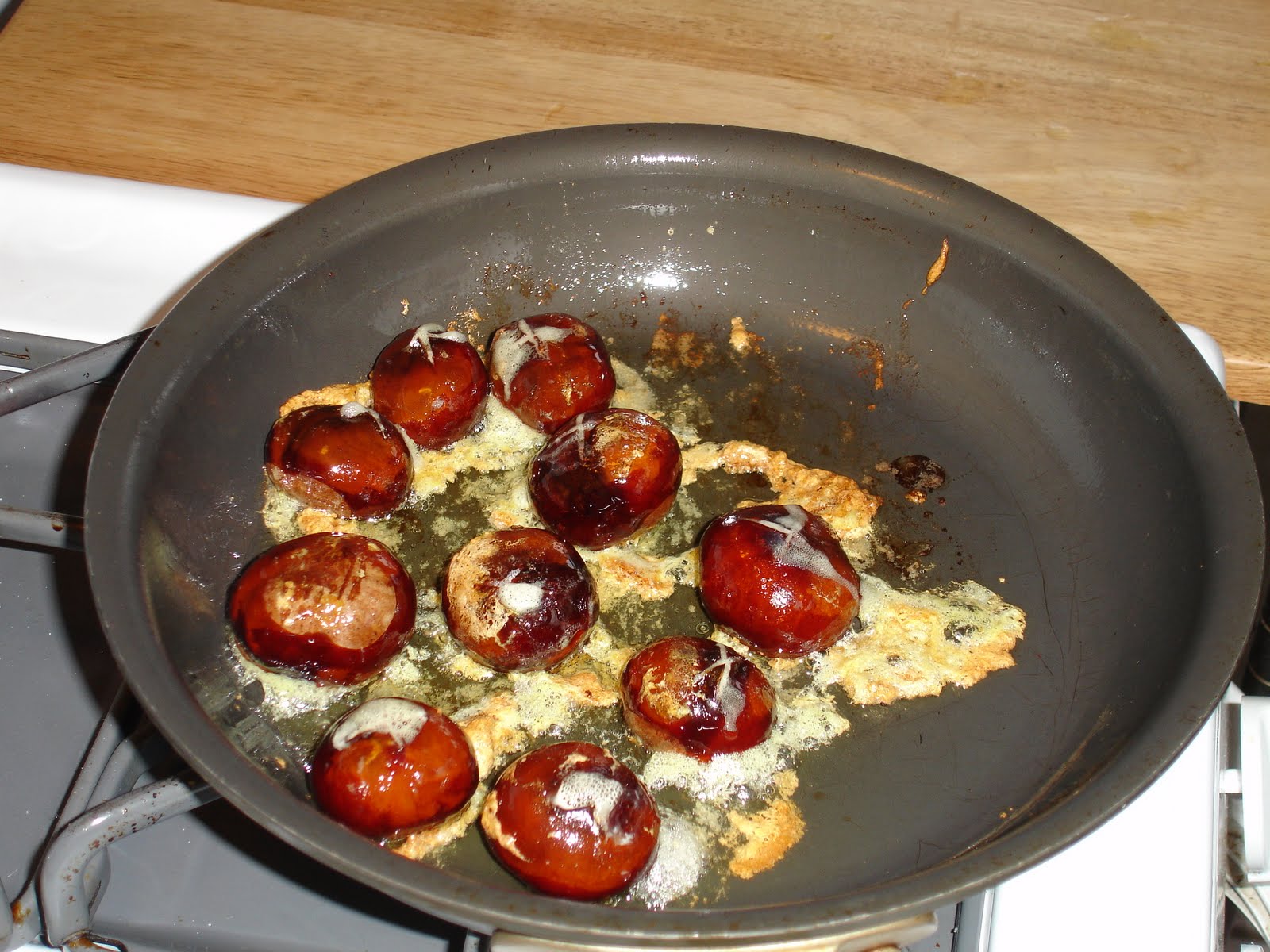 The foraged nuts we cooked exhibited a few differences. 1) When we notched the x into the shell, they started to give off some oil. That must mean they’re really fresh and will be especially tasty, much better than those dried out supermarket nuts. All nuts have oil — that’s why you can buy bottles of hazelnut and walnut oils for gazzilions of dollars in the health food store. Gold mine of chestnut oil over here! 2) When we put the nuts in the hot oiled pan, the nuts really started to give off their juice. It just started bubbling out of the marked notch and fried like a thin dough. It smelled absolutely wonderful — just like fresh crispy french fries.
