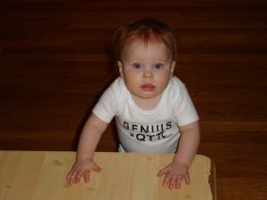 An addendum to the only one little accident on the hard wood floor happened just after this went to print and we can now report accident #2, literally and on Grandma and Grandpa's floor. But she carefully wiped her hands on the bedspread before crawling out to the kitchen. There's a good reason why babies are so cute.