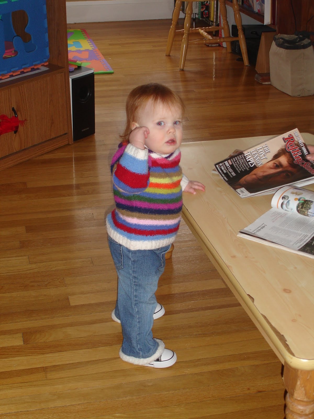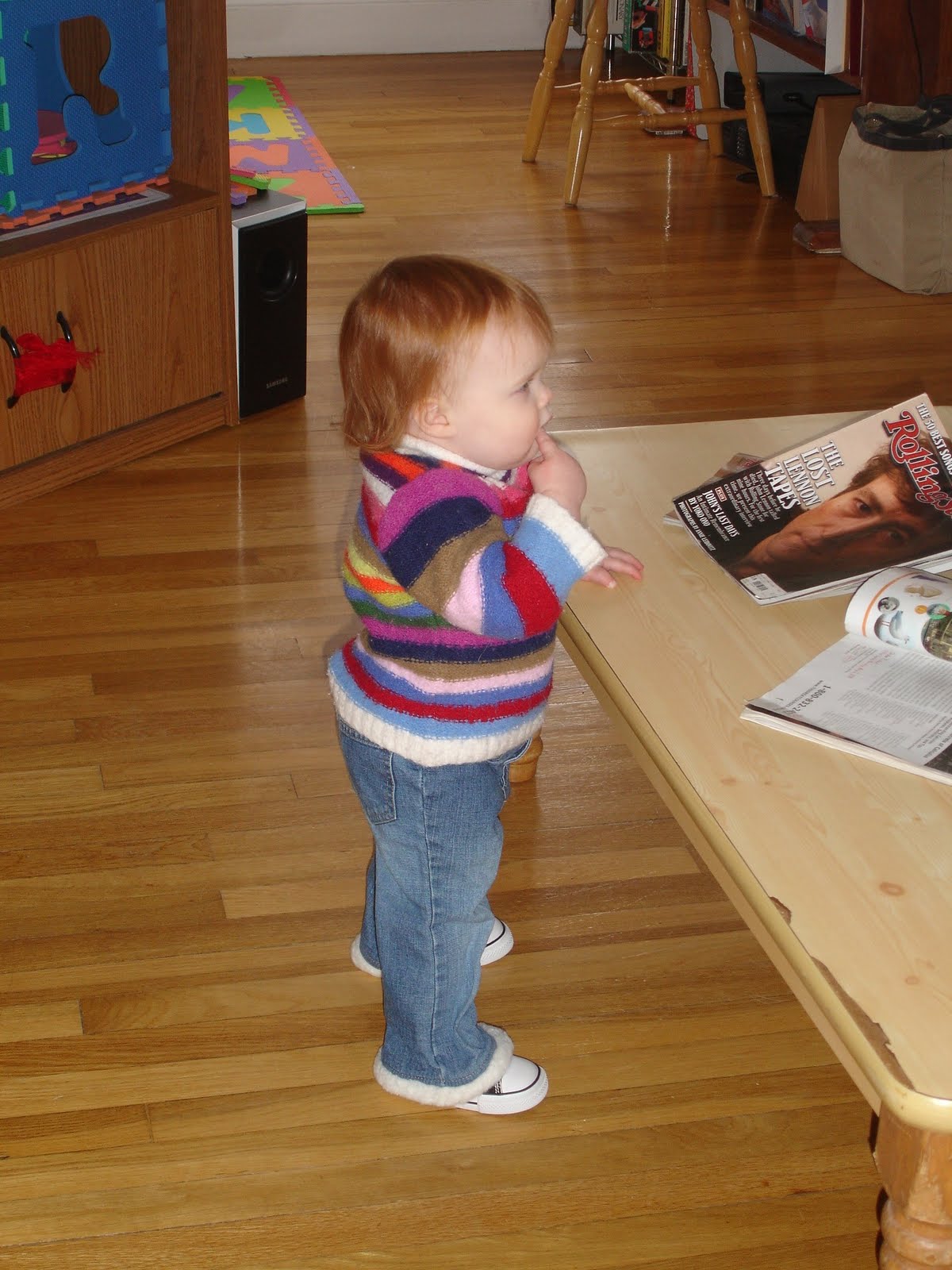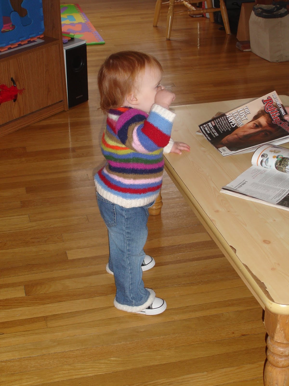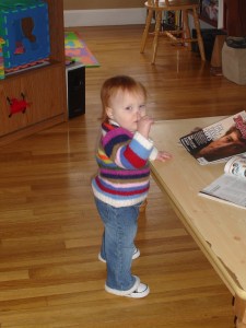 The teeth extravaganza has calmed down. Mostly things are back to normal. Sleeping. Eating. Patience. She still has a few left over new behaviors — like staying rigid as a board when she doesn’t want to be picked up or laid down, or biting the closest available item when she gets too excited or frustrated — but we’re trying to work on extinguishing those guys. If she doesn’t get anything positive out of it, I figure she’ll drop it eventually.