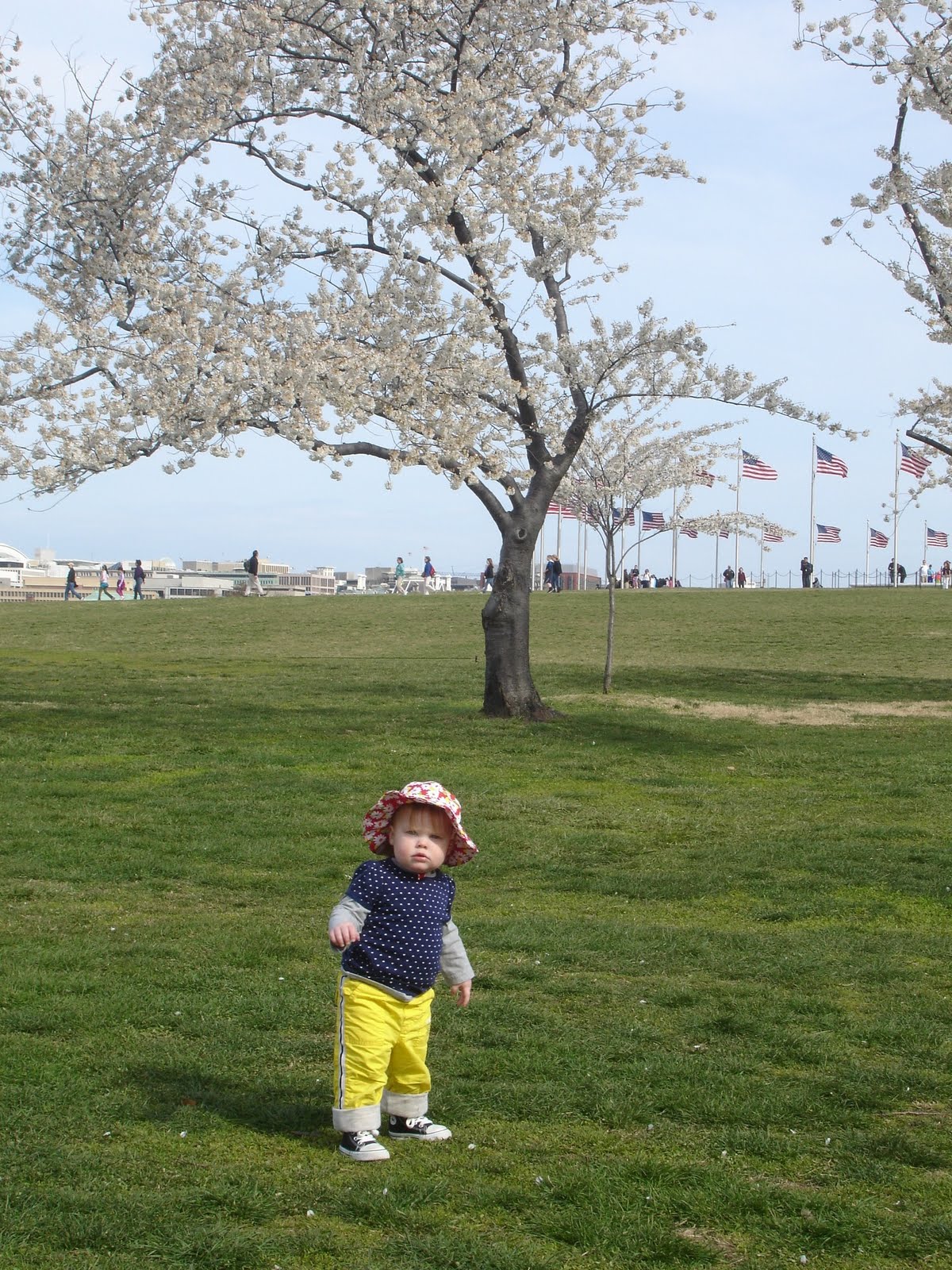 Cherry blossoms were first on our agenda. They were very pretty, but you know, not as spectacular as my imagination had conjured up. But Maggie really liked just being allowed to wander on the lawn and run around picking up sticks. She spent quite a lot of time going down a hill and then up it, then down, then up. And applauding for the little kids on stage singing in Japanese.