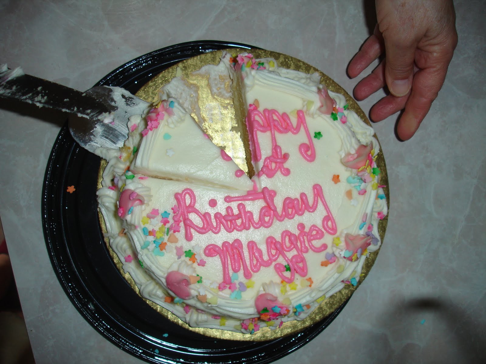 Why, you ask, are you eating a “Happy 1st Birthday” cake for Maggie? Clearly that date has already past. Well, we went shopping at a new store this week, one where the rumor is that your kid gets a free cake on their first birthday. So when we were going past the bakery, we casually asked if it was true. They said “Yes, pick out one of these.” They never asked when her birthday was or questioned why I have such a large and precocious infant. They just asked her name, gave us a coupon for the register, and off we went to have our cake and eat it too! (It’s not cheating the system if we didn’t get one when she actually turned one. We just got behind schedule, is all, for our justly deserved free cake. That’s our story and we’re sticking to it.)