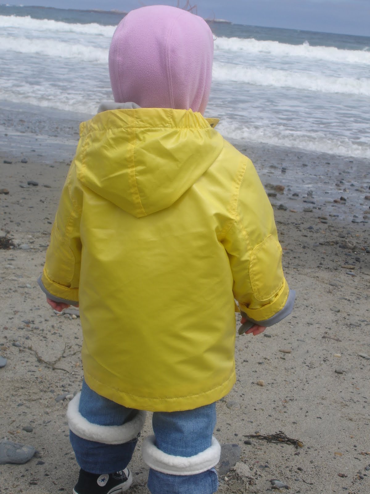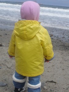 We went to the beach this weekend, for the first time in Maggie’s memory. We taught her the word ocean which she repeated as often as she does Eliza. She waved hi and bye and generally thought it was an alright place, as long as she wasn’t too close alone. We threw and skipped rocks, and she thought that was pretty fun. She would pick up a rock and hand it to me and ask me to throw it in. “Momma. Rock.” Then point to the water. Actually she was more interested in the rocks that form the wave break than in the actual ocean. But it was nice to see her with that great expanse of water before we move to the great expanse of dirt and rocks.