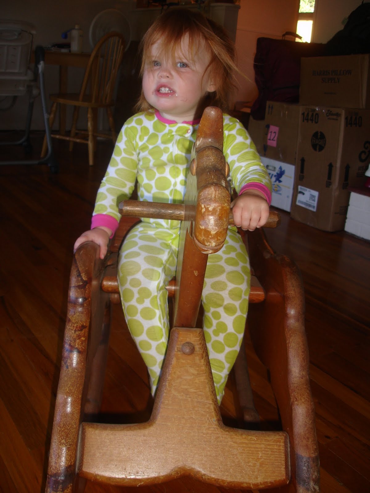 This has been a pretty ordinary week. Maggie’s gotten to be good friends with a couple of little people here, so every other day or so she gets to play with someone besides me. She’s having fun with all the boxes being empty; even though the jungle-gym is getting smaller, there are “new” toys in those boxes! She gets very involved when I pull out something that she hasn’t seen in a couple of months now. Let me tell you, this kid has got toys!