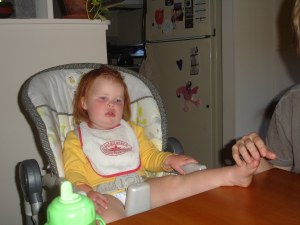 Maggie is getting more and more independent and wanting to be treated like a kiddo and not a baby. She will either climb into her high chair and sit down herself, or she’ll insist on sitting on a big-person chair at the table. She increasingly wants to be the one to handle her spoon or fork, from plate to mouth and back again. When I’m cooking and she nags me to pick her up so she can see what I’m doing, she’ll fetch herself a stool to stand on if I suggest it. She praises herself for doing things alone. She’ll look at me after she accomplishes her task and say “Self!”
