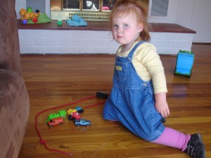 Maggie is big into questions nowadays. One of her favorites is “Come from, Mama?” She’ll point to something or name it and then wants to know how it got to be where it is now. Some days we go through every single item of clothing we both have on. She’ll hold out her shirt; “Come from, Mama?” “Nana bought that shirt for you.” Point to her tights; “Come from, Mama?” “Baku Sue sent those pants.” “Shoes. Come from, Mama?” “Those shoes came from Nora.” Then she’ll start on my clothes. And I have to remember the store or the location where my clothes originated. She’ll do it with food. With cars. With toys. It keeps my memory working.