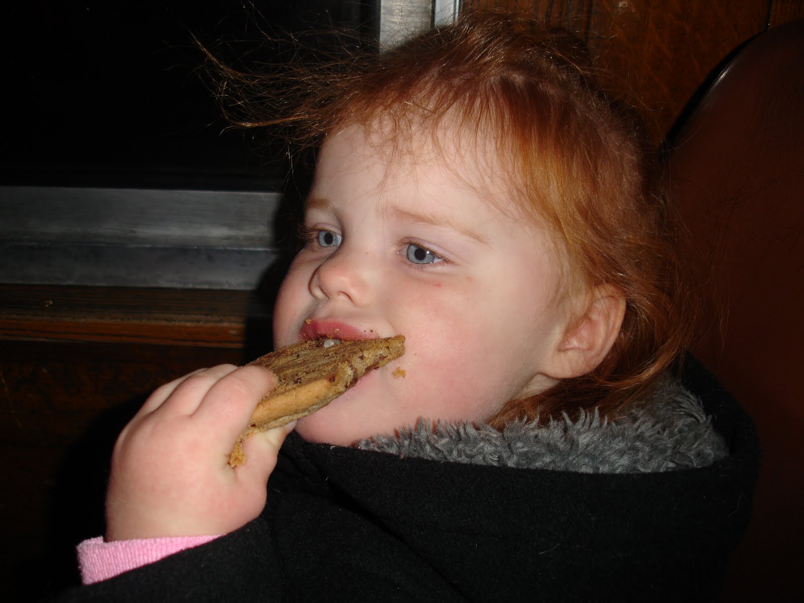 On the train, our car’s usher handed us cookies that Mrs. Claus baked for us that morning and of course there’s hot chocolate too and they read the book over a loudspeaker and we all take turns looking at the pictures. Maggie liked the cookie especially, but she also enjoyed painting in the fog on her window and occasionally seeing Christmas lights on houses outside in the dark. Once we got to the North Pole, we could see Santa on his sleigh with some elves out in the snow. Maggie kept yelling that she wanted out at this point, but that may be because some mom had misunderstood what was going to happen and might have mentioned that Mags could go sit on Santa’s lap and tell him what she wanted for Christmas. I don’t know who could have said that to the child.