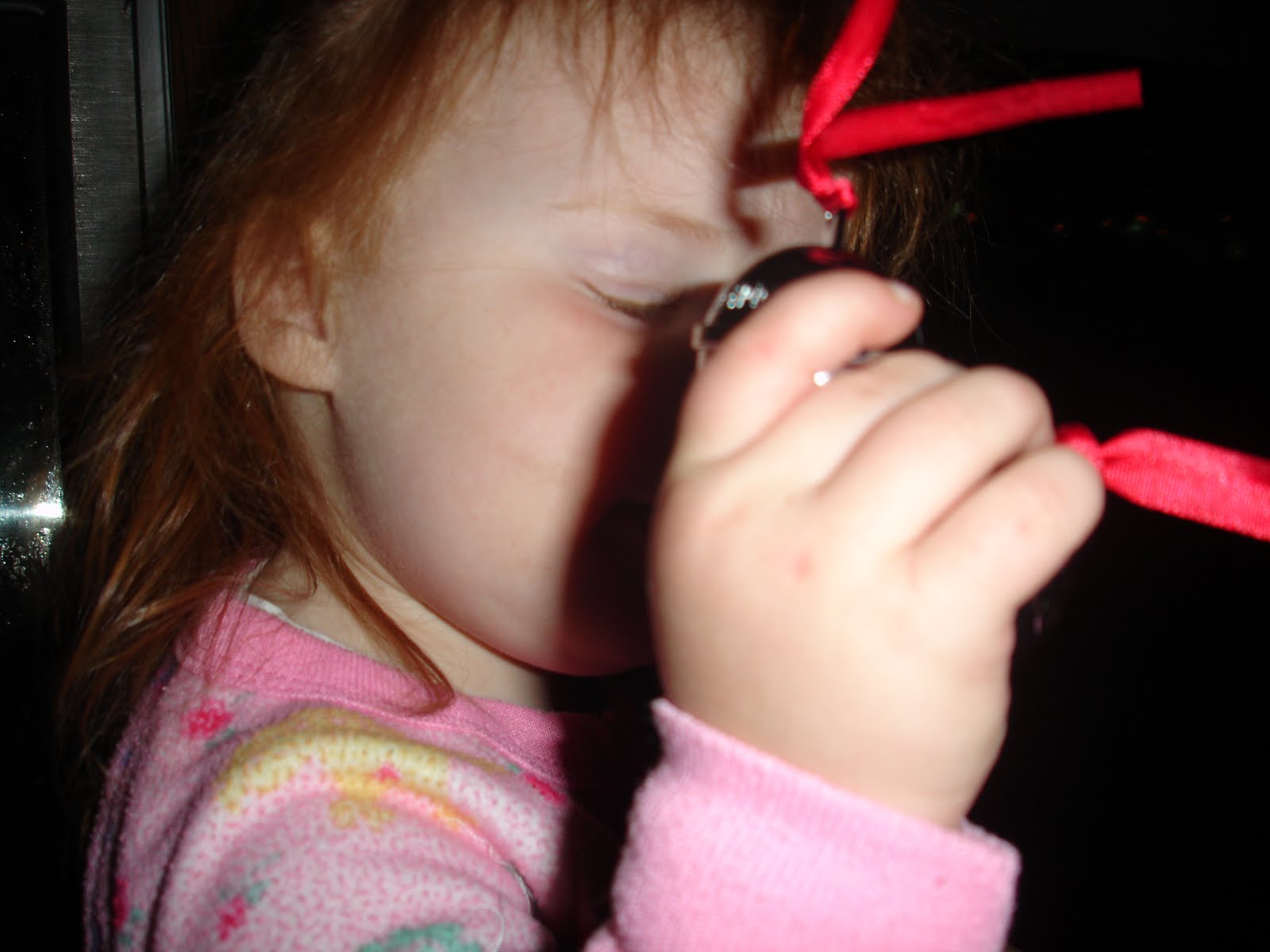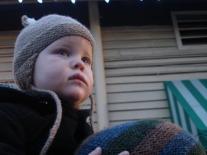 Maggie was somewhat pacified by the promise that Santa would get on the train and come give her a present. We tried practicing saying “hi Santa” and “thank you Santa” but Mags was too shy to really interact with The Man. She did accept his bell with a kind of awe and enthusiastically jingled it all the way home. (Bill got a bell too, but apparently I haven’t been a good girl this year. Any ideas how to repent for Santa in just a few days?) Luckily there were Christmas carols to sing all the way back so a sugar-highed two-year-old could shake her bootie and jump up and down with spirit.