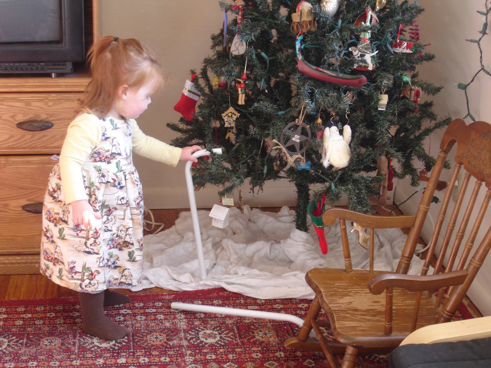Maggie’s New Year resolution: to sleep in a big girl bed. We bought a railing for our current guest bed and Maggie and I put it together in preparation for moving the whole thing into her room. That’s her trying to hang parts of the safety railing on the tree like candy canes. So far she’s been playing on her new bed every day and we talk about how it will become hers pretty soon. She likes to pretend to sleep on it and have me cover her up with blankets. So we’re on our way I think.