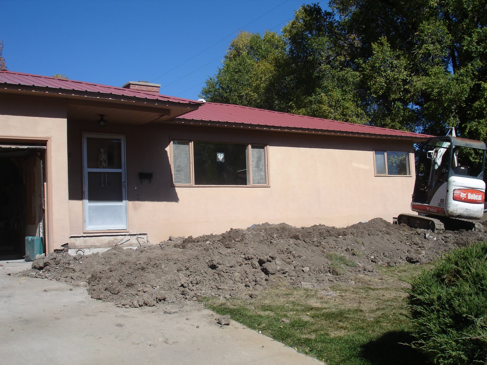 Next thing we had to address was the amount the front of the house had sunk due to shale slippage. The middle of the house was a good 3 inches taller than the front door, which is fun for rolling little trucks and getting rid of unwanted guests, but not so great for door frames and window frames and hanging pictures (which wall do you square corners to?), not to mention you feel drunk walking around even stone cold sober. Solution: drill helical piers down until they hit bedrock and then prop the house’s foundation on those at the correct level. Which isn’t quite as much work as it sounds. But you do have to have the correct kind of (dry) weather for a while, and all the laborers available, and all the parts in one place. So our house looked like this (yes, with the bobcat too) for about a month. “Thanks for letting us join the neighborhood. Now we’re building a huge moat around our house to keep everyone out and letting large pieces of equipment rust in the front yard. Got a problem with that?”
