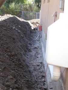 First things first — stop water from seeping down the mountain to the soil under our house. This was the biggest factor in the house moving every year; soil gets wet and swells, house goes up; soil dries out and sinks, house goes down; crick; crack; crick; crack. The solution was to dig a perimeter foundation drain around the house. That’s a fancy way of saying you dig a ditch, lay down some gravel and porous plastic pipe, cover it up, and forget it’s there. Then all the moisture takes the path of least resistance (our pipe path around the house, not under it) and drains out another non-porous pipe to the street.