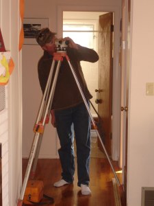 Now we’re ready for leveling day! Project Manager Mr. Mark came in with his surveyors’ equipment and measured all over the house. And then the outside team started cranking their jacks in coordinated fashion (“We’re gonna do 5! Ready? Crank. Crank. Crank. Crank. Crank. Stop!”) and the house popped and creaked and Mark measured and remeasured and they cranked some more and Mark measured some more and the house groaned itself into alignment. Ta da! A level house! And miraculously all the doors in the house all of a sudden shut (except the front door — oops) and no windows burst and no pipes were ripped apart.