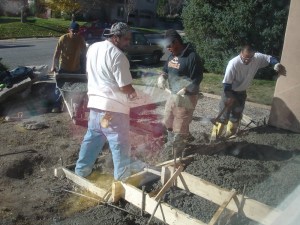 Waiting for perfect weather again, we were ready for the last phase: relaying concrete. They had to replace the top part of the driveway, the front stoop, the back stoop, and we added a little patio under the front window while they were at it. Six guys, running up our steep driveway with wheelbarrows full of wet cement and furiously shoveling and smoothing and barricading us in the house for a day. And then it was done and we have our house ready for living in for the next 55 years.