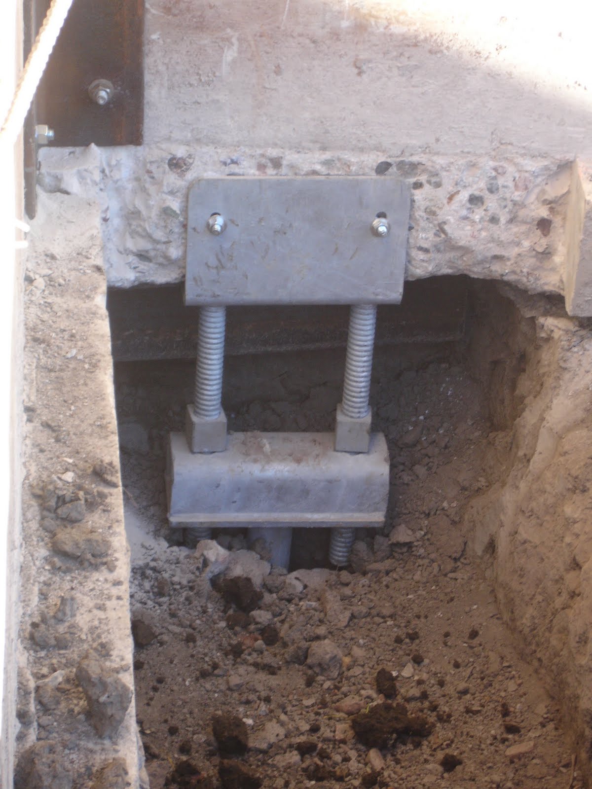 Eventually everything fell into place and six of these babies were inserted around the south front and east side of the house. Down 27 feet, in case anyone is wondering. They also put in a couple of steel plates (like at the top left of the picture) to keep the foundation together where the cracks had formed over the last 55 years.