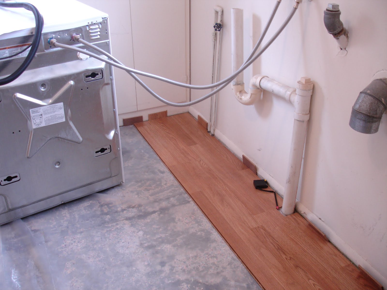 We went to the big chain home improvement store and bought the cheapest laminate flooring we could find. When we redo the entire kitchen in a few years, we want something easy to remove, and something that wasn’t a big financial investment for that short time. Thanks to some help from Santa in the form of gift certificates, this project cost us just under $100.