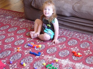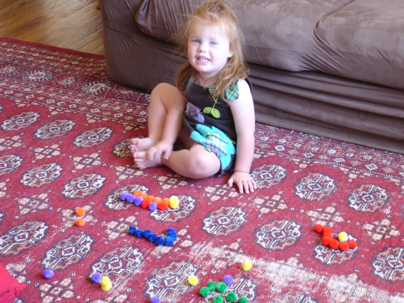What is Maggie doing? Making candy canes and caterpillars of course. The best $1 I ever spent to lure my child out a store and into the car has been these craft pom poms. She thinks they’re really fun to manipulate, step on, dole out, sort, and when she gets tired of playing and starts chucking them at me, they don’t leave a mark.