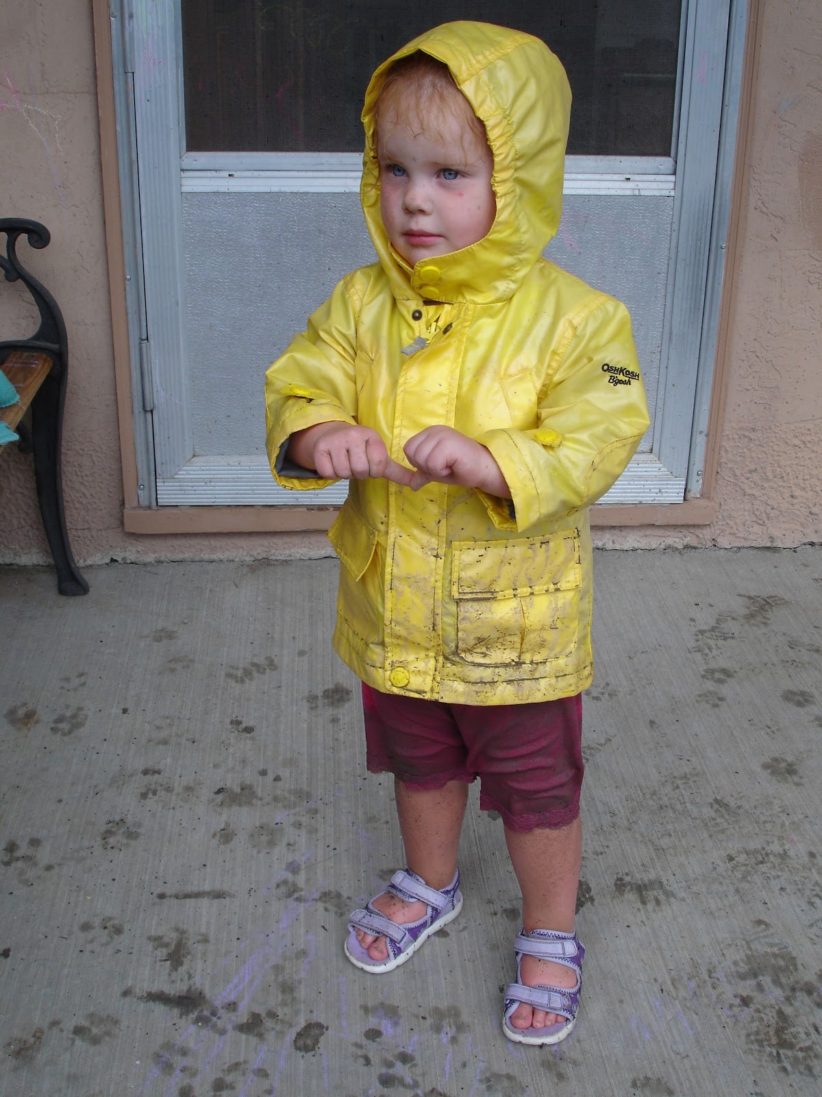 Maggie is a hiking fool! She has gone for a hike almost every day for the past week and a half. And she rocks it! She can go a couple of miles and is excited about rocks and sticks and smells and climbing up and running down. Perhaps her favorite one was the mud hike we took after a huuuge rainstorm. The trail above our house turned into a muddy running stream, so we put on our water shoes and went for it. This picture is after we walked home on the streets, so she’s much cleaner after puddle jumping than on the trail.