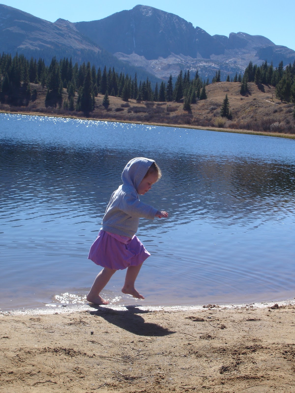 So we tell you a lot about the hikes that are awesome and Maggie summits and there’s music in the air and everyone goes home happy and proud and eating gummy worms. Then there’s the other sort of hike. The kind that begins 5 miles outside of Durango with a little voice from the backseat: “Daddy, Mommy forgot to buckle me in.” And sure enough, we have to pull the car over for Bill to jump out and actually put her in her carseat since Mom was too distracted or tired or something to do it when we actually left the house. Then we get to our destination and we start down the trail but turn around to go to the outhouse. Then turn around again to get the hats and mittens out of the car. Then go 5 minutes before a little voice complains about being chilly-willy and wanting water and needing a snack. So we pick out a good rock for a pick-me-up and try again but it’s no different so the little one goes up on Daddy’s shoulders so we can hoof it back to the lake for a real picnic and rock throwing. Except it’s a sandy beach with no rocks to skip and Maggie pees just standing and looking at the water, so off come the tights and the socks and the shoes with the hats and the mittens and the picnic involves neighbor-picked apples with worms or dropped apples in the sand and Eliza is shivering because she went into the lake after an apple bit and we decide it’s beautiful here in the fall and the sand feels nice on bare toes and that a couple of candy corns in the car with a movie sound like a good idea.