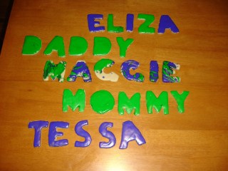 Maggie and I took on a cookie project this week. She helped with the dough; she’s a great roller-outer. Then she helped me sound out everyone’s name and picked the letters out one at a time. She cut out the dough, out the letters on the sheet, and only snitched once! Then she got to pick out the colors for frosting, and we went to town! Her name definitely turned out the coolest.