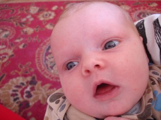 Tessa’s doing great. She’s still a good eater; our bathroom scale has her above 10 lbs now. Although it seems like she’s spitting up entire meals sometimes, it doesn’t seem to be doing her any harm. We’re trying to be zen about the whole thing, changing clothes and burp rags as needed and often and not being too grossed out about the big ones. Yesterday we were on a walk and met a neighbor who had yet to see Tessa. I opened up my jacket where she was snuggled in against me and saw that she had spit-up all over her face and my shirt. The neighbor made some generic remark about “beautiful baby” and so forth and we continued on. Way to make a first impression, Tess. Gross. And on the other end of things, she’s gotten herself on a kind of funny poop schedule. She’s off for a day, and then the next day every diaper is poopy. On one day, off the next, on, off. We’ll try to schedule your babysitting for an off day.