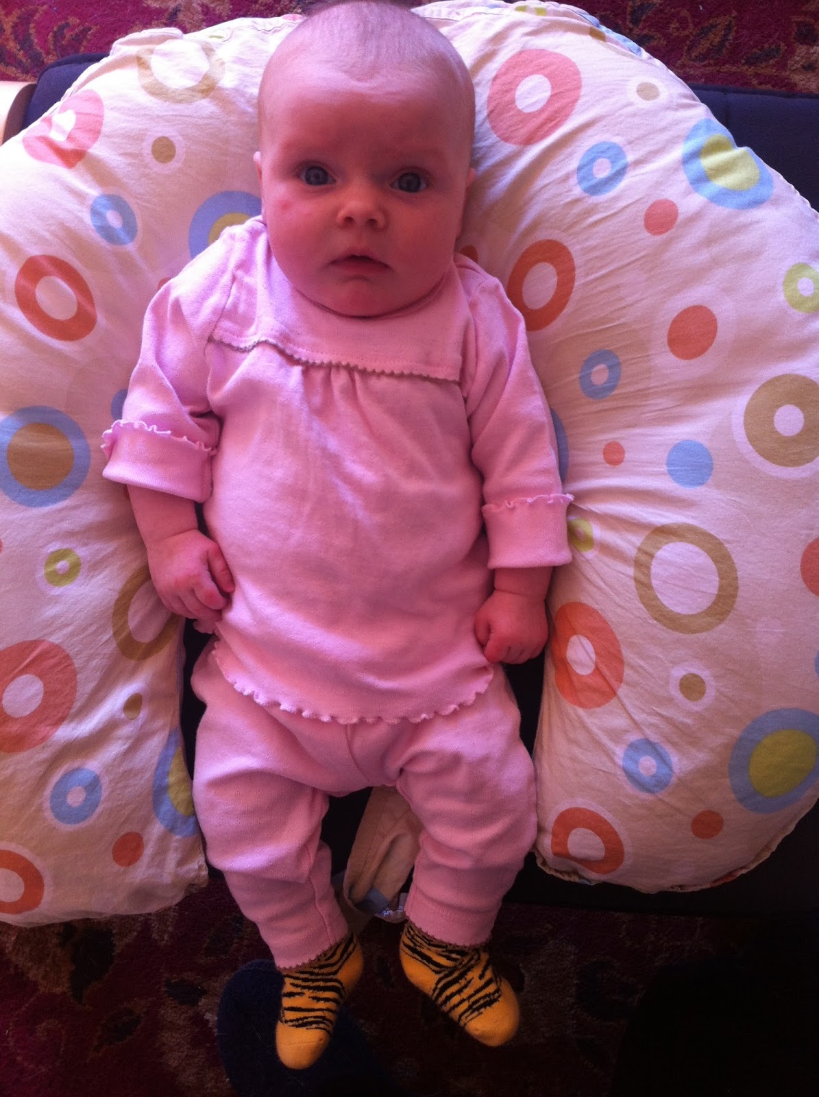 Tessa is so much bigger than Maggie at this age, so we’ve had to ask a friend for her seasonally appropriate 3-month clothes. Remember when Maggie got all those hand-me-downs from a friend in Boston? Now we have all sorts of new perfect teeny clothes for Tessa. Thank goodness; we’ll have a chance at telling them apart in baby pictures.