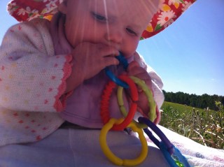 We have retired the pacifiers as sucking soothers. She is not interested in them in the least, and will probably cry harder if we try to give one to her. She has instead begun to rely on her index and middle fingers for soothing. Or big toes if they happen to be handy. She does sometimes like to chew on the rubbery, smooshy pacifiers, though, so we’re keeping them around. But I much prefer her fingers since they can’t be dropped on the floor, lost in a restaurant, or kept out of her control.