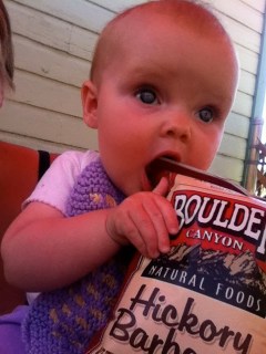 Little Miss Grabby Hands likes to snatch at anything. She’s tasted curry, ketchup, pickle juice, and coffee by virtue of sticking her fingers in my plate and moving them immediately to her mouth. Can’t say she’s really been a fan of any of these grown-up foods, but she’s interested in exploring anything we bring to the table. Or anything we put near her, edible or not. Tessa is a very intentional baby. You can see her look at something, concentrate on it, and then deliberately move her body and hands toward it to grab it. She’s not some fly-by-night, trial-by-error, shoot a sea of bullets and one will probably hit the mark girl. She focuses on what she wants, takes aim, and gets it.