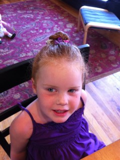 Introducing Princess Butterfly-butterfly-purple-pink Effy-effy-come-on-lets-hide Fluffy-fluffy-white Collins. Or at least that’s what she told us her name was a couple days ago. And it didn’t change when asked to be repeated. Otherwise known as Maggie, this girl is just full of It. Full of imagination, of energy, of humor, of trouble-making, of obstinance, of smarts, of curiosity. She fairly refuses to wear anything except a dress, is newly obsessed with buns in her hair, and is moving steadily toward no more diapers at nighttime. It is still difficult to get her to school (every morning before school she tells me “I don’t want to go to school”), but I whisk her into the car and by the time we get there she hardly remembers to say goodbye to me. She read her first book a couple weeks ago, about Mat and Sam. They sat. Then one sat on the other. And they switched. And Maggie could sound out or recognize all the words herself. Last week she went down the water slide at our rec center by herself. It’s 38 steps up and a half dozen curlicues down, and as long as Daddy was at the bottom to catch her, she’d do it over and over again. Maggie sometimes takes the initiative to interact with or soothe Tessa and is very much looking forward to the day when they share a room, and then in the future have bunk beds! She comes up with things that just melt me, like “Thank you for a delicious dinner, Mommy.” And then makes me want to pull out my hair by doing things like aiming her pee out of the toilet onto the floor while giggling madly. She gets thoroughly excited about the most wonderful things, such as a new tube of toothpaste or street-sweeper going past our house. And just in general makes our days as unboring as we couldn’t ever have imagined.
