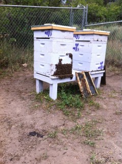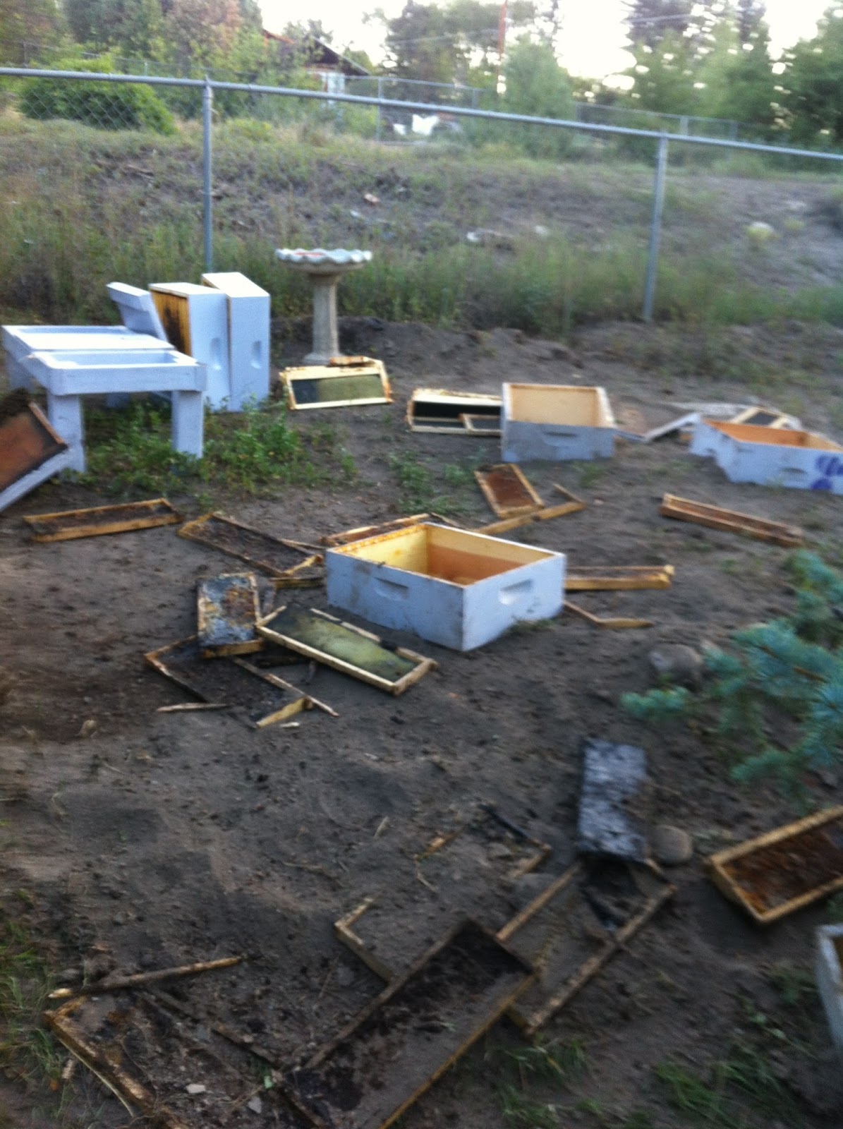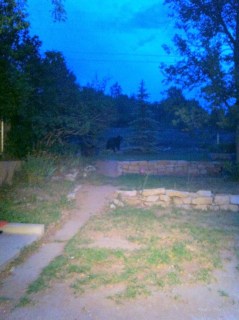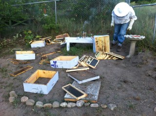 And before Bill got back from reinstating the hives, before it was even really dark, that bastard bear came back for more. I went out back and yelled at it to leave us alone and not ever come back and called it some bad names. It didn’t exactly high-tail it and scamper away from my wrath, but it did climb over our fence and amble away along the neighborhood. So far as we know, it hasn’t come back again yet. But those bear noses are soooo sensitive, they can smell honey a long way off, and we are now on the radar. We won’t bring any bees back until we have a better system in place. Either a super tall and sturdy enclosure is needed, or an electric fence. Since we don’t have any neighbors behind us, we’ve always planned on getting an electric fence. So we’re saving our pennies, now that our gamble has failed.