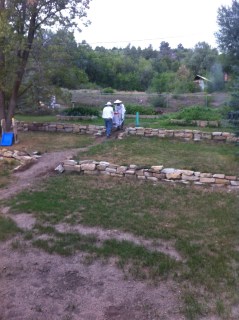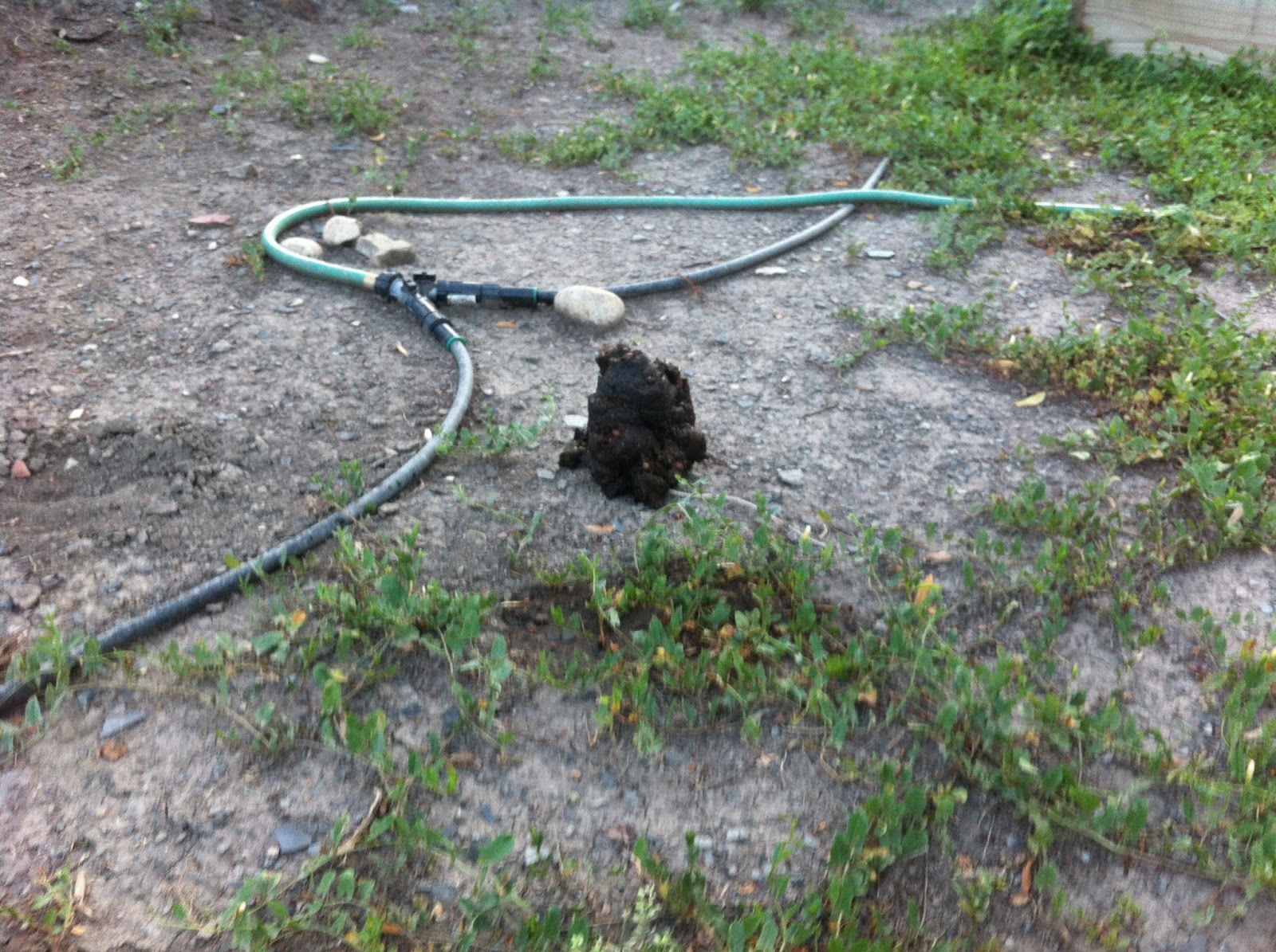 By that afternoon, things weren’t looking so good for Priscilla’s hive. This is not normal bee behavior, and we were pretty sure they were going to swarm away. Not even a pending storm and “rain” (from our sprinkler since the sky didn’t cooperate with its own) could persuade them back inside. Probably Priscilla is dead, either from the bear or from exposure all night.