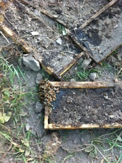Bill went out and tried to make sense of the carnage. He went through every box and frame and tried to piece our hives back together. The bear just tipped over Aretha’s hive and didn’t bother very much to rip things apart. But Priscilla’s hive was a wreck. Bill found teeth marks and swipe marks over many frames where Mr or Mrs bear got a good meal. Several frames were absolutely torn and broken, and a couple were flat out missing, having been taken along for a later snack.