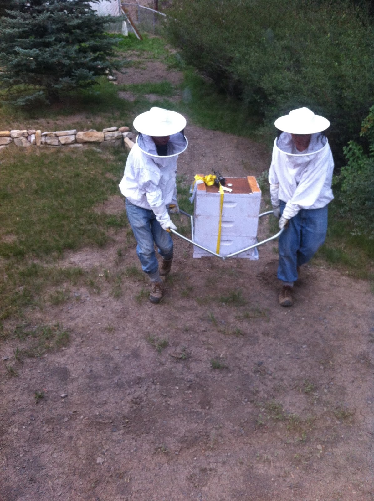 We were absolutely sure the bear would return, now knowing where to get a good tasty meal, so Bill decided to move the hives away from our backyard and up to his bee yard on campus where there’s a tall and sturdy fence surrounding it. So he and a friend smoked the heck out of Priscilla’s hive, got them inside and boarded up, and carried both hives out of our backyard to the truck.