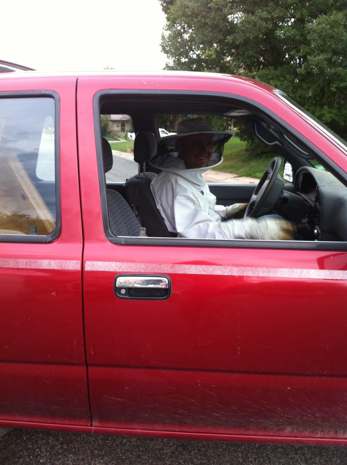 Bill had to drive with his veil and gloves on; these were not happy bees! He said he got quite a few looks as he went through town.